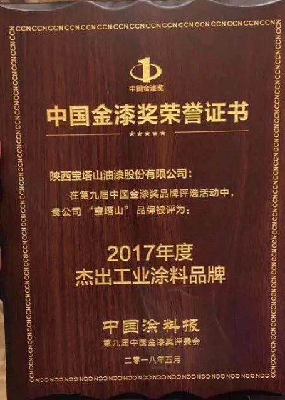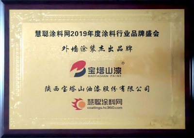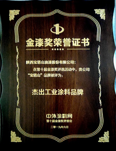 2019年6月,寶塔山漆的“寶塔山”品牌在中外涂料網第十屆金漆獎評選活動中被評為“杰出工業涂料品牌”