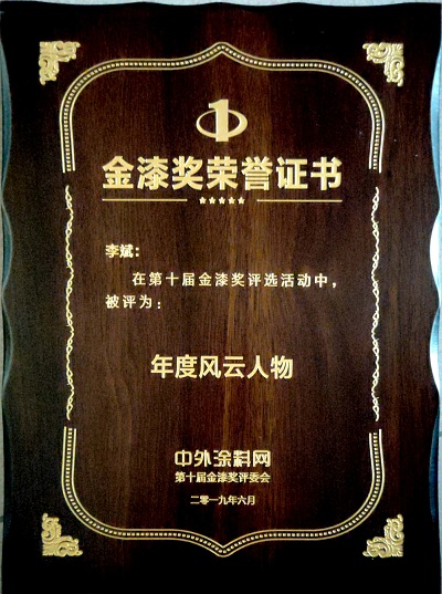 2019年6月,寶塔山漆李斌同志在中外涂料網第十屆金漆獎評選活動中被評為“年度風云人物”