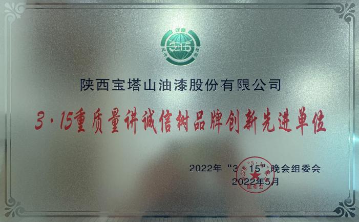 2022年5月,寶塔山漆榮獲“3·15重質量講誠信樹品牌創新先進單位”。